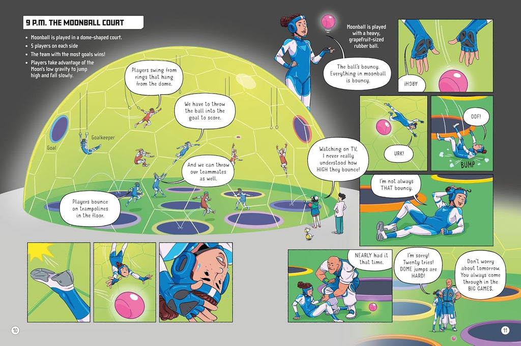 Follow a girl's thrilling first day on the Moon. She explores every corner of her father's base, and finds out how everyone is kept alive and fed in such a hostile environment. She'll learn about fusion power, robot mining and the futuristic sport of Moonball.Inspired by the latest scientific breakthroughs and anticipating technological progress to come, this is an exciting story based on real Moon science.- Told in lively comic book style- Written with expert advice from UCL Professor Paul Kuin, Department of Space and Climate Physics- Perfect for school projects- Discover more books in the 24 hours in... seriesChapters in this book include:- Approaching the Moon- Coreolis Base - Shackleton Crater- In the canteen- The moonball court- A view of the base- Time for bed- All around the Moon- Time to get up- The farm- The dangers of the Moon- Robotics and construction- A history of the base- Underground reservoir- Why exercise is important- Space observations- Moon suit- Garage airlock- Shackleton Crater- A solar storm strikes- Getting to the stadium- Game time- Our future on the Moon