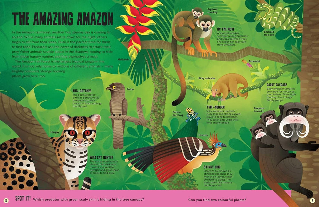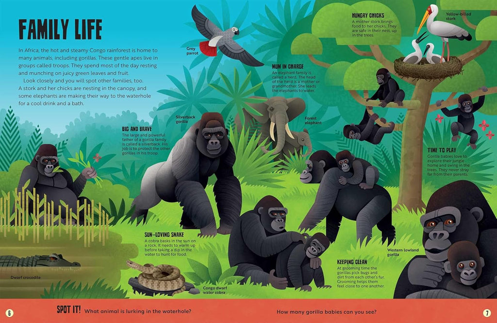 Get ready for an exciting adventure through the world’s jungles. Explore the Amazon rainforest to see squirrel monkeys and Emperor tamarins scampering through the tree canopy. Meet a gorilla family in the Congo and watch them groom each other while their babies play. Feel the heat of the Indian jungle as you spy tigers on the prowl. Marvel at lemurs and sifakas as they leap between baobab trees in Madagascar.