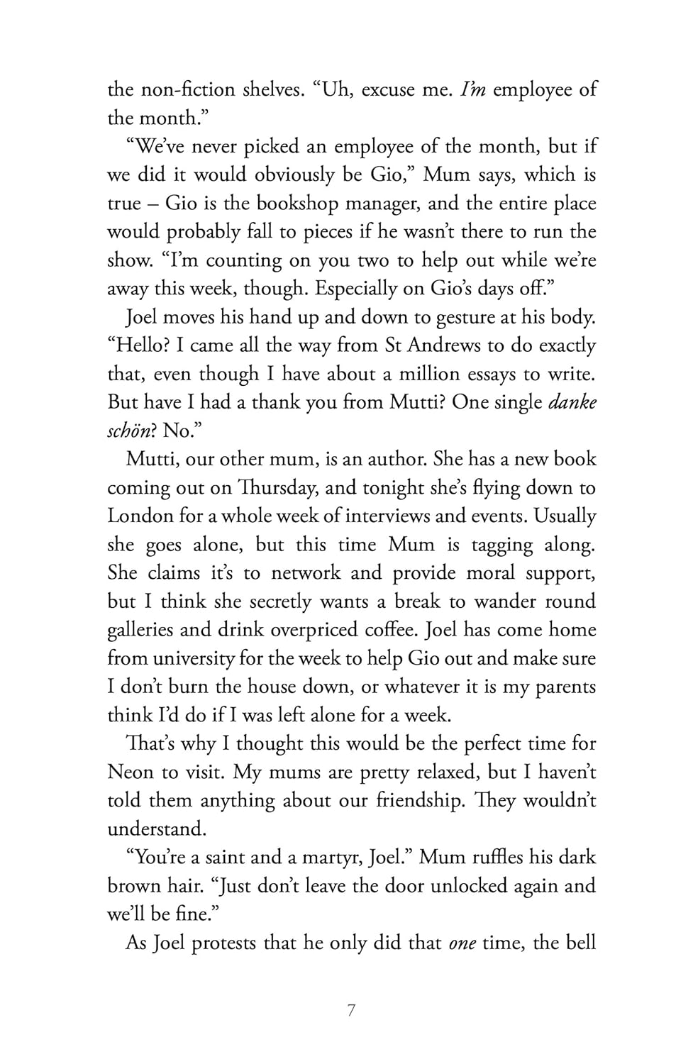 Neon is the boy Laurie's been dreaming of for the last six months, and he's exactly as she had created him - down to his ability to play any instrument he picks up. And when he steps off the train and into Laurie's world, he teaches her what it means to be real.