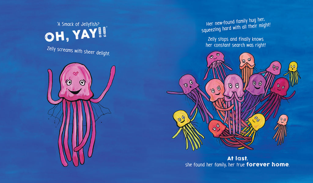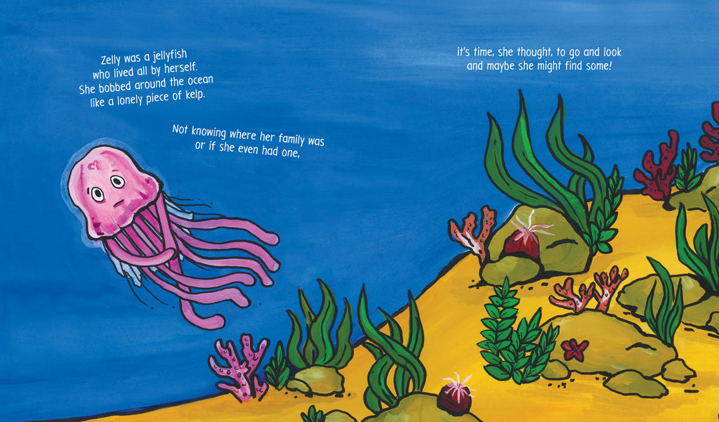 The ocean is a fascinating, expansive world of colour and otherworldly animals. Meet Zelly the jellyfish who finds herself alone and searching for others just like her. She goes on a search for family and belonging. Zelly encounters an astounding group of animal friends and learns what they're named whilst seeking their advice. An adventurous underwater story of family, friends and collective nouns.