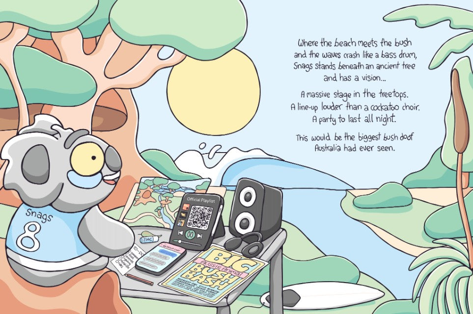 Get ready to party with Snags, the coolest koala in the bush, as he sends out an invite for an unforgettable bush doof! Meet a grooving wisdom of wombats, a head-banging mob of emus, a bopping bask of crocodiles and even more party animals!