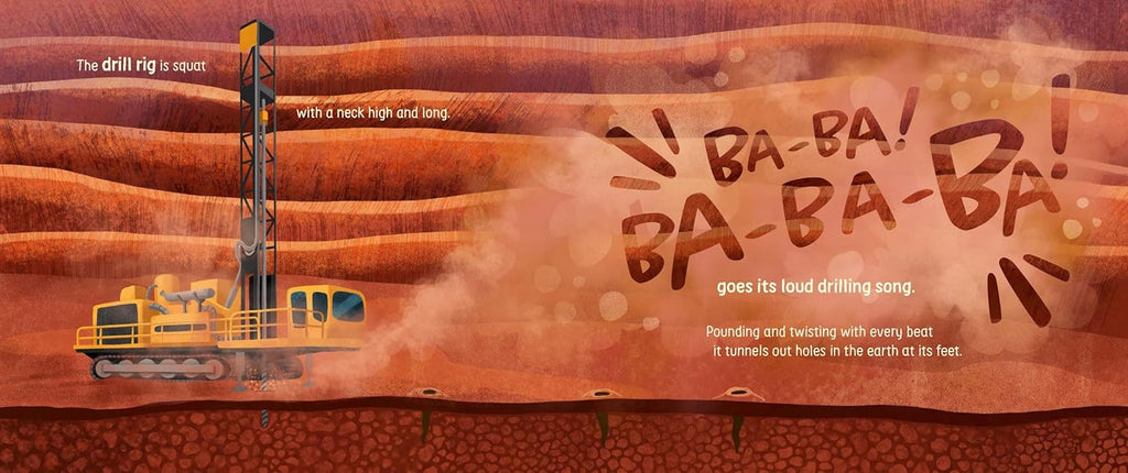 Outside the town in the heat and the dust, where the sky is bright blue and the earth is like rust, is an iron ore mine that's bigger than big, with mighty machines that blast, drill and dig.