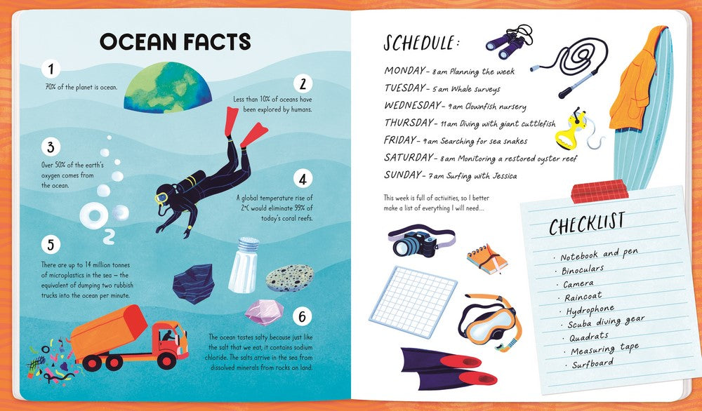 Follow a week in the adventures of a marine biologist, and learn about our magical, mysterious watery world. Full of amazing facts, incredible creatures, and beautifully illustrated, this book gives you insights into: ·whale monitoring and how these enormous creatures talk to each other, how clownfish populations are increasing with the help of hatcheries, how giant cuttlefish are the chameleons of the sea and communicate by changing their skin colour,· discovering a new species of sea snakes, how humans are building reefs to help protect diverse marine life from extinction, and how surfing teaches how to ride the waves and understand the ocean.