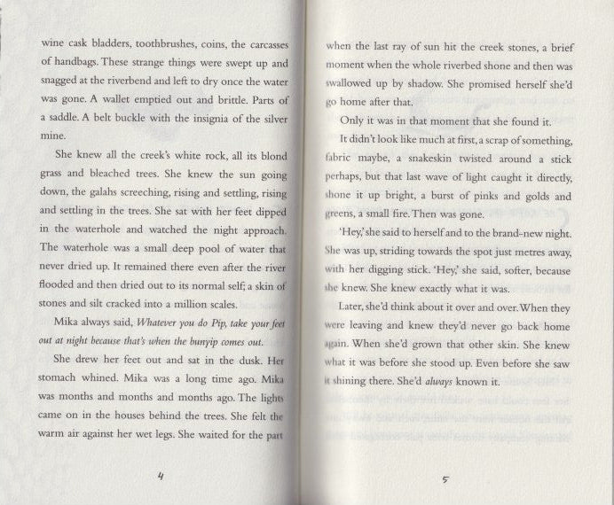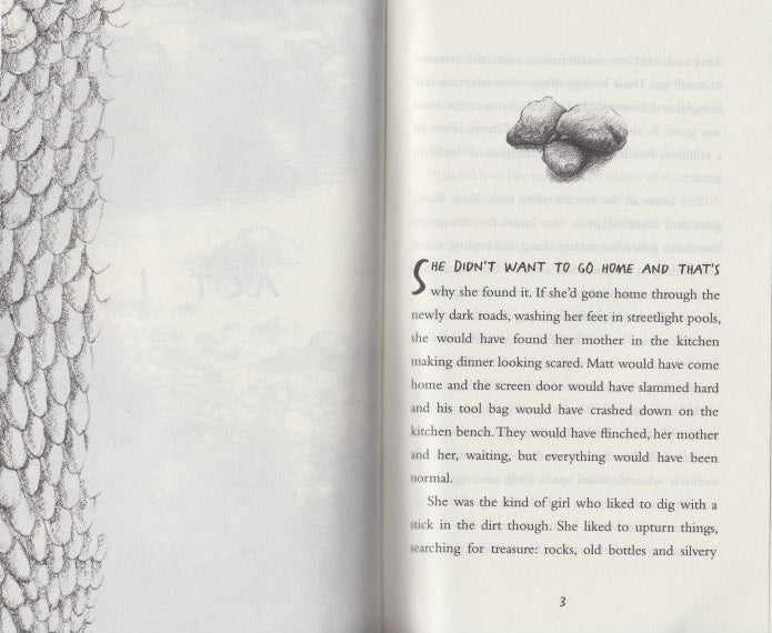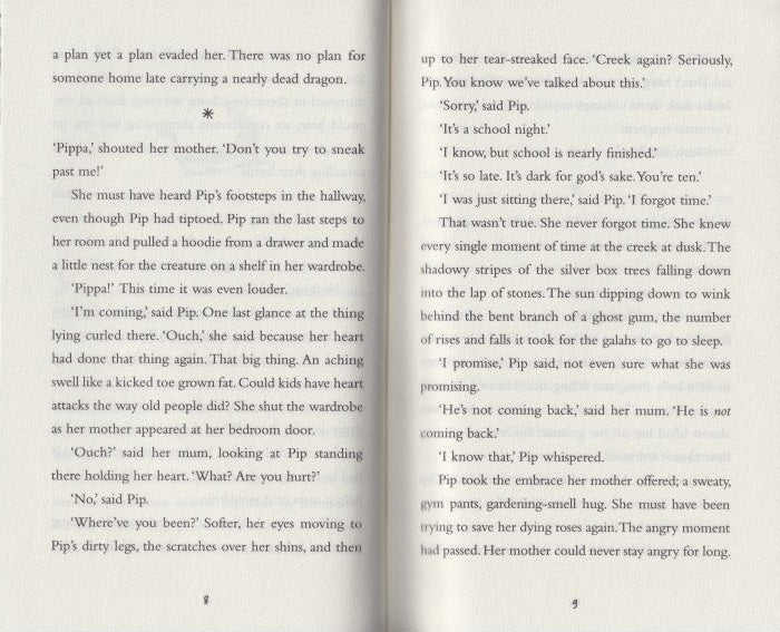 Pip never wants to go home. She likes to sit at the waterhole at dusk and remember Mika, her best friend. At home her mother's not the same since her boyfriend moved in. They don't laugh anymore and Pip has to go to bed early, turn off her light and pretend she doesn't exist. When she finds a half-dead creature at the waterhole, everything changes. She knows she has to save this small dragon and return it to where it comes from. But how?
