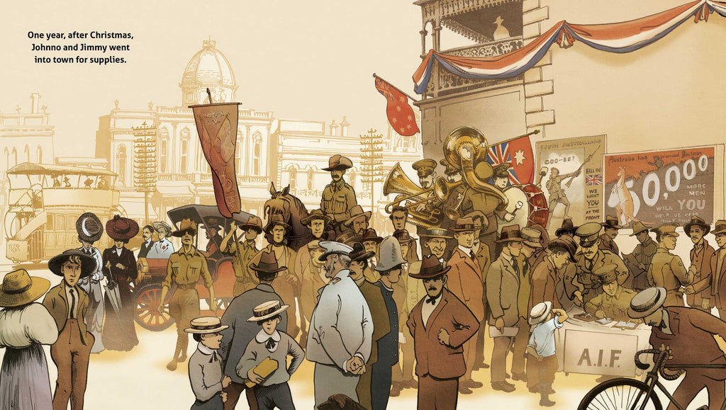 This is a touching friendship story about Jimmy and Johnno, two young Australian boys in the 1900s; mates who do everything together, sharing adventures and growing up side by side in the dusty cattle yards of an Outback South Australian station and later on the dusty WWI battlefields of the Middle East.