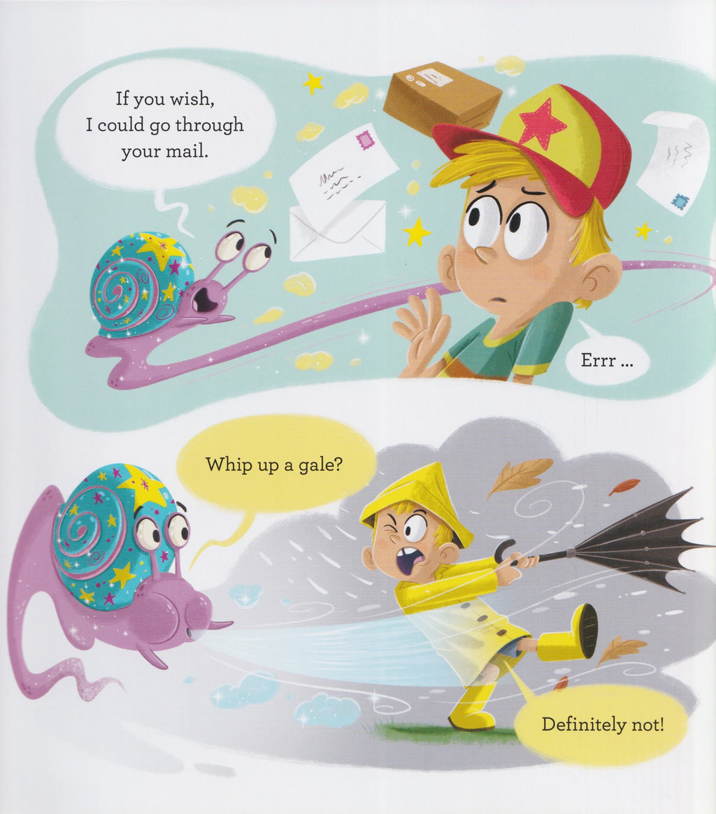 Give this regular garden snail a rub and "POOF! He turns into Genie Snail" a finicky critter who leaves a trail of magical mayhem wherever he goes.
