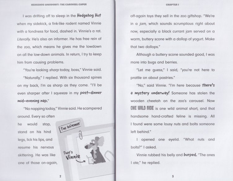 It's merry-go-round mischief for Hitch the hedgehog! Hitch, a shrewd and edgy hedgehog detective, and his food-loving sidekick, Vinnie, are back with another mystery to solve: someone's stolen the wooden cheetah from the City Zoo's carousel, and, according to Vinnie, "The longer it takes to pinpoint those pranksters who took that cheetah, the more animals they’ll likely steal, which could mean more pinching, more plundering, more pilfering! IT’LL TURN WILD AROUND HERE!”