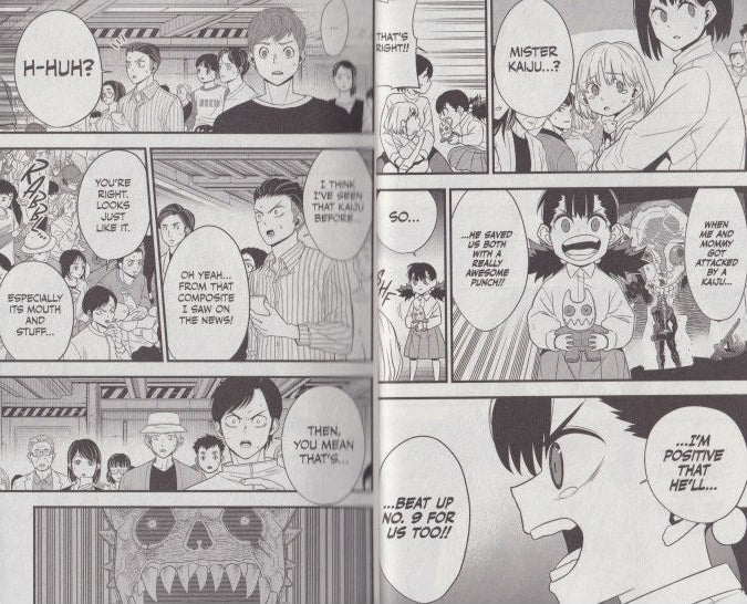 Thanks to the efforts of the new generation of soldiers, Kafka makes it in time to save Mina Ashiro from Kaiju No. 9. Not only that, he has a host of improved Defense Force–style combat techniques tailored to fight his enemy. But with Kaiju No. 9 able to access the absorbed Isao Shinomiya and his wealth of martial arts knowledge, will Kafka’s refined battle techniques stand a chance?