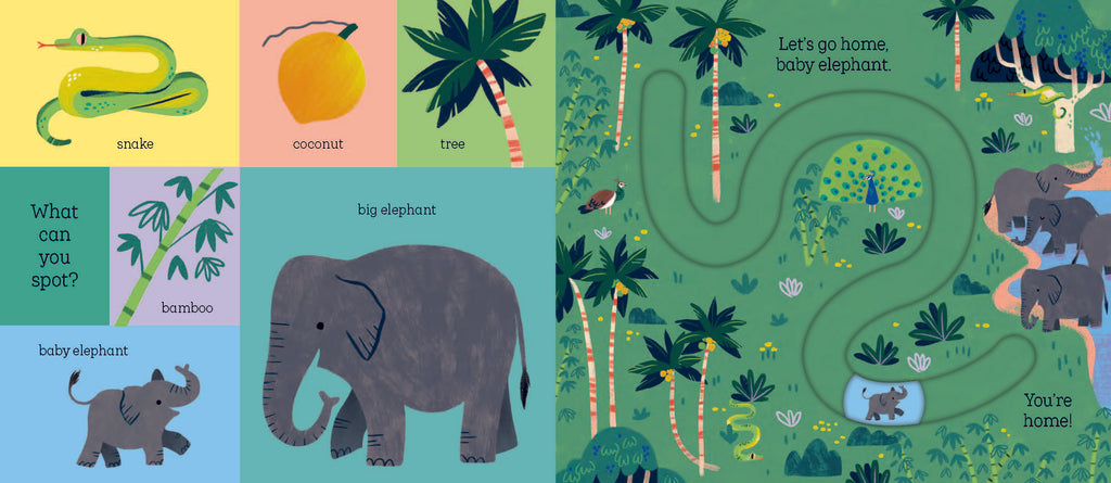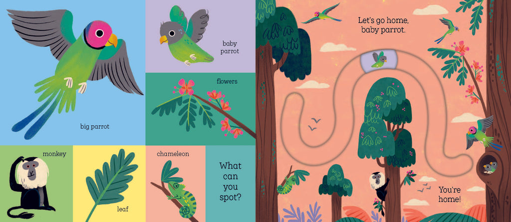 Meet tiger, parrot, elephant and crocodile - four adorable baby animals who are lost in the jungle! With easy-to-use moving parts and four unique tracks to develop hand-eye coordination and concentration, babies and toddlers will enjoy taking the baby animals home in this robust, satisfying board book. Scan the Stories Aloud QR code on the back cover the read along with the story!