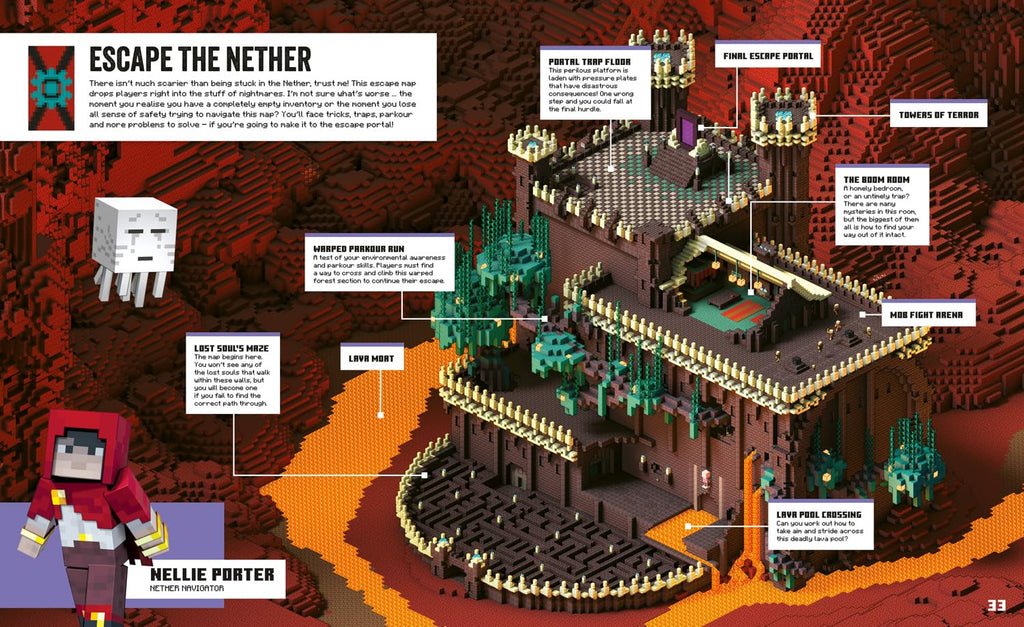 Epic Escape Rooms contains thirteen incredible builds to inspire you to construct the most inventive maps in Minecraft. Each one brings unique ideas and contraptions designed to test players and make it hard to escape! There's a zombie prison break, pirate island, haunted house and an underground science lab, plus many more original builds.