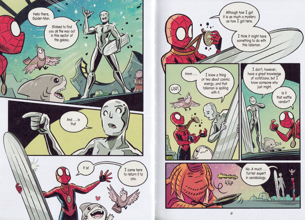 Spider-Man has ventured into space to return Silver Surfer’s surfboard to the spacefaring hero. But what starts as a simple mission quickly evolves into a new mystery involving a collection of rare talismans that can give their owner great and potentially dangerous cosmic power. Before he can return home, Spider-Man must discover where all the talismans are and just what their purpose is in order to ensure they don’t fall into the wrong hands. Good thing Spidey has joined forces with the perfect super hero team—the Guardians of the Galaxy—to see this mission through! With the help of Groot, Rocket Raccoon, Star Lord, Gamora, and Drax, can Spider-Man save the day and secure his way home? Or is he fated to be lost in space forever?