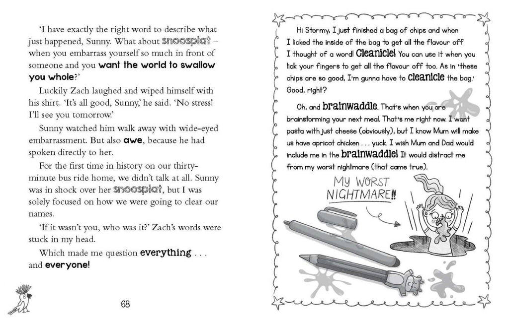 Best friends Sunny and Storm are besticles with a wondermonious talent for creating new words. But now they’re also prime suspects in a crime they didn’t commit. Armed with their diary, their secret language and some very tasty cupcakes, they’ll have to become the best detectives in town to put things right.