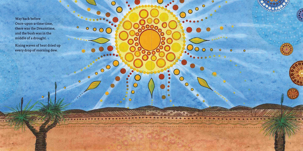 Way back, before Once-upon-a-time there was the Dreamtime and the bush was in the middle of a drought. After a storm, one large rainbow curved down. The Super Snake slithered down that rainbow on to the earth and promised the Elders he could help them find water. That Super Snake called out, You can t have a rainbow without water. Dhurraluwi guuma-li Come together! Wantima Rise up! Woorri Share.