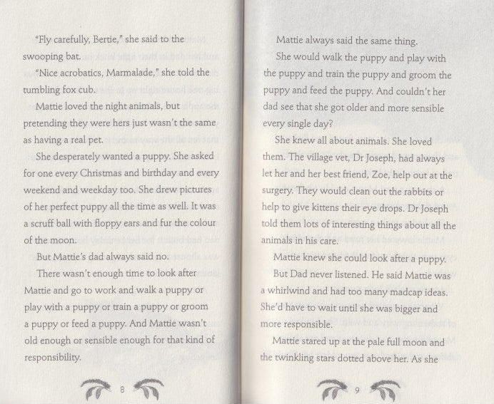 When Mattie wishes on a shooting star for a puppy, she knows her wish is hopeless. Her dad just doesn't believe Mattie is responsible enough to look after a puppy. She finds the next best thing when she and her friend Zoë start helping the new vet and animal rescuer, Dr Polly. Mattie still may not have a pet of her own, but she has amazing adventures rescuing a runaway ferret, trying to stop a greedy goat from eating everything in the garden and looking after an adorable puppy with a hurt paw. But as the animal rescue gets more and more crowded, Mattie, Zoë and the vet's son, Casper, realize that they need to do something more. Can they help the animals find their forever homes?