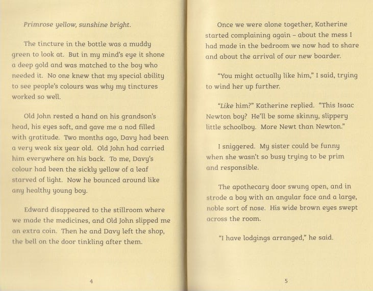 Ann Storer has inherited her grandmother's mysterious gift of healing, which she shares through the special tinctures she dispenses in her family's apothecary shop. When she combines her talents with the genius of a young Isaac Newton, recently arrived to board above the shop, the two create an incredible elixir with seemingly unlimited powers.