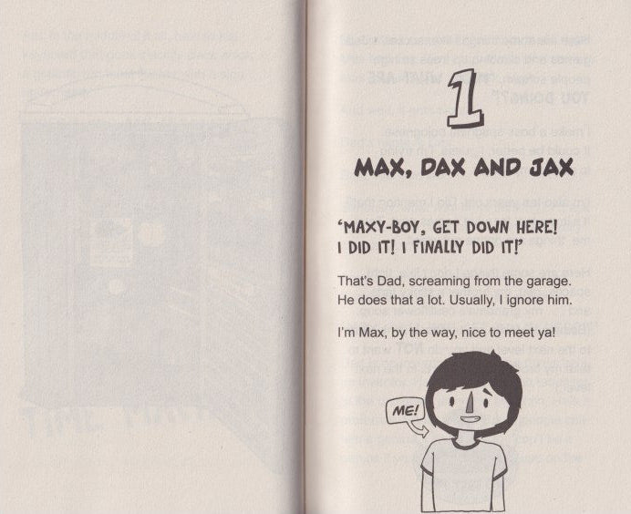 And the biggest problem is not how Max is going to unclog the toilet. If he doesn't fix the time machine in under 12 hours, both his dad and his little brother will CEASE TO EXIST . .