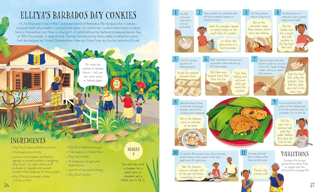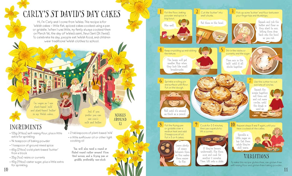Join families from all corners of the globe as they share their much-loved recipes for special occasions and festivals. Whether they're for Ramadan or Passover, for a national day, a birthday or just a big family get-together, all the recipes are simple, heartfelt and delicious. The families, and the simple, step-by-step instructions, are illustrated in a bold, graphic-novel style. From Nigerian party rice to U.S. Halloween cookies, each recipe brings authentic international cuisines, traditions and stories to your table. Also featuring fascinating facts about regional festive traditions and ingredients. All the recipes are vegetarian, and instructions are also included to make them vegan, nut-free, dairy-free, egg-free and gluten-free - or any combination of these. Celebrations featured include: St David's Day (Wales); Halloween (USA); birthday (Italy); Passover (Jewish diaspora); Twelfth Night (France); family time (Sudan); Girls' Day (Japan); Barbados Day (Barbados); Christmas Eve (Germany); Day of the Dead (Mexico); Palm Sunday (Spain); Lunar New Year (South Korea); ANZAC Day (New Zealand); pool party (Brazil); Rice Festival (Indonesia); Shrovetide (Finland); Thanksgiving (Canada); Ramadan (Bangladesh); wedding (Guyana); party (Nigeria); New Year (Bulgaria)